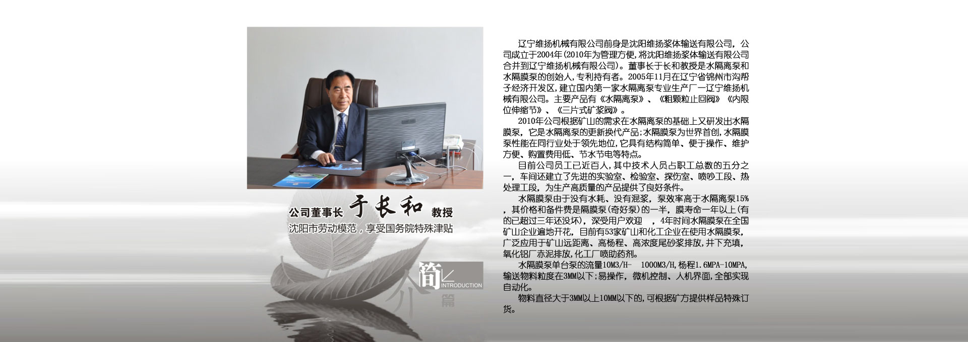 遼寧維揚機械有限公司生產基地位于遼寧省北鎮市溝幫子鄉姚屯910-37-731號,辦公地點設立于沈陽市大東區,地理位置優越,交通方便。 公司成立于2004年。公司董事長于長和教授原為沈陽大學教授,曾任中國漿體輸送學術委員會副主委,退休前個人持...