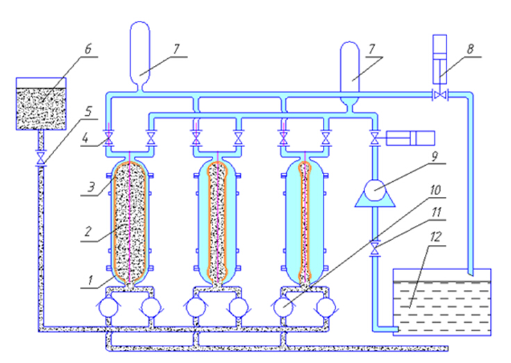 (1)罐體(2)尾礦(3)隔膜(4)清水閥(5)三片閥(6)喂料箱(7)穩壓灌(8)三片閥(9)清水泵(10)逆止閥(11)閘閥(12)清水池